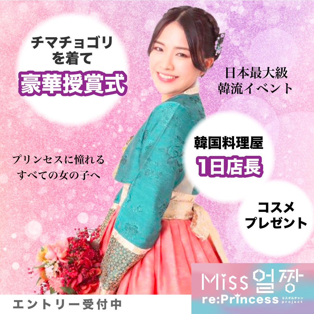 チマチョゴリを着て授賞式、憧れの韓国プリンセス体験ができるコンテストです。PV出演や韓国料理屋1日店長、コスメプレゼント、街頭ビジョン広告掲載など副賞も充実しております。韓国好きな女性のためのコンテストになります。