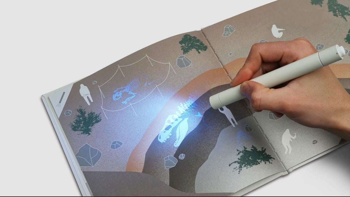ブラックライトで照らすと化石が浮かび上がる絵本とシール、ブラックライトのセット。 絵本で学んだ恐竜を部屋に隠し、光で発掘し、見つけた化石シールを絵本に貼り戻して、自分だけの博物館を作ります。
