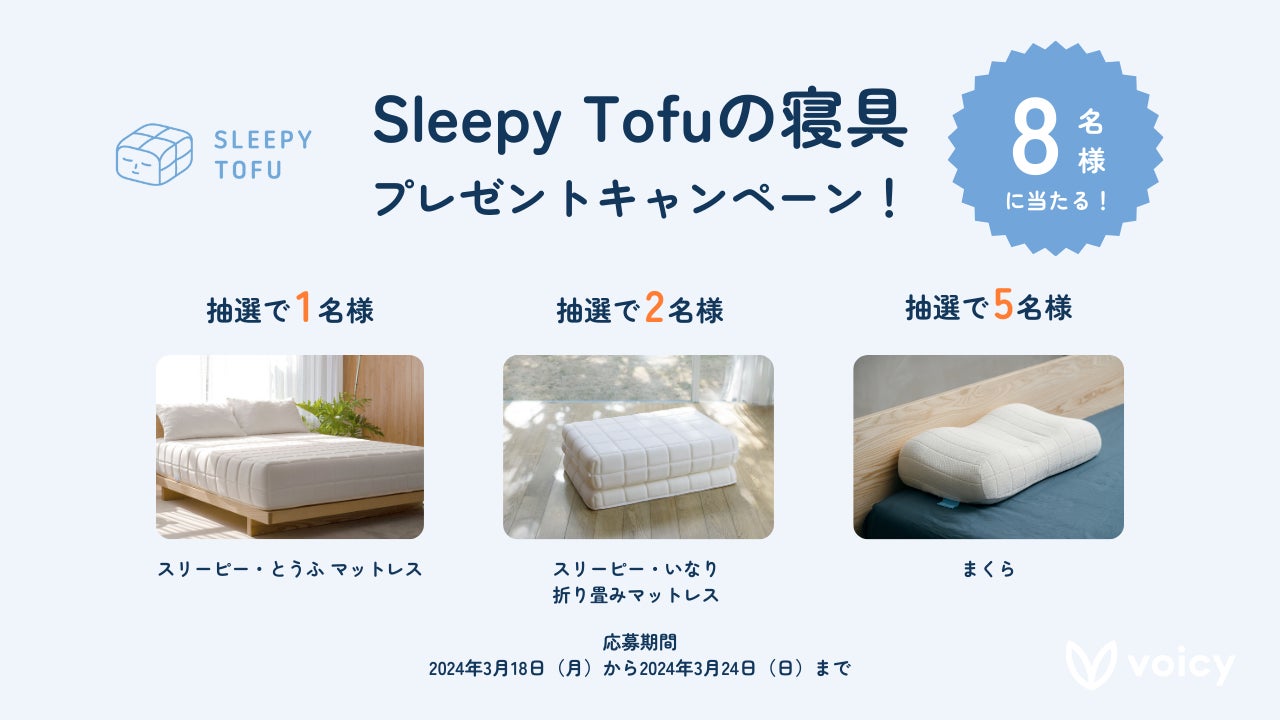 Voicyの放送を指定のハッシュタグをつけてXでシェアして応募することで、Sleepy Tofuのアイテムが当たるキャンペーンを実施します。