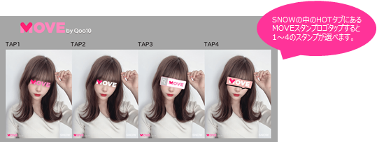 このキャンペーンは、SNOWのスタンプでHOTタブに設置されたMOVE コラボスタンプロゴを使用しMOVEのレビューに投稿してくれたり、SNSに指定のタグをつけて投稿してくれた皆様の中から、「いいね」数が多かった方を“BEST MOVER”として選出する企画です。選出されたBEST MOVERには、「屋外大型ビジョン」へ出演(7日間放映)できるビッグチャンスが与えられます。