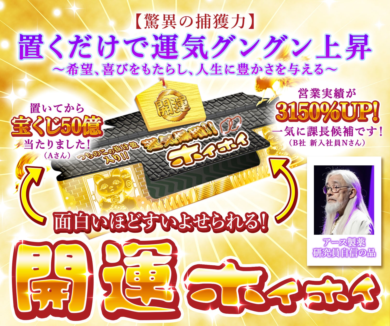 そこでマーメイドの涙を加えた25パターンの配合調整にて分析した結果、すごい数値を叩き出しました。その数値はなんと8万ルミナス。この配合になってから開運ホイホイの驚くべきパワーを確信する出来事が起こりました。開発に携わった社員の運気もどんどん上がりました。競馬に行けば万馬券、パチンコに行けば連日フィーバー、さらに彼女ができた社員も。全ての野望まで叶わせる力があります。このようにこの「開運ホイホイ」には運気を集めて人を幸せにする力があります。