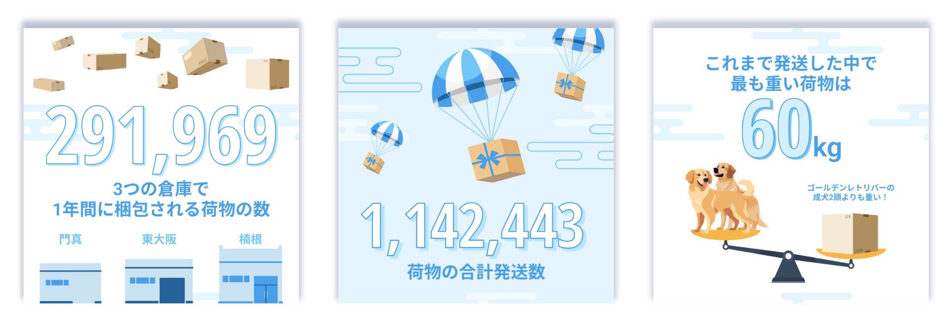1年間に梱包される荷物は29万個を超え、荷物の合計発送数は114万個にのぼります。