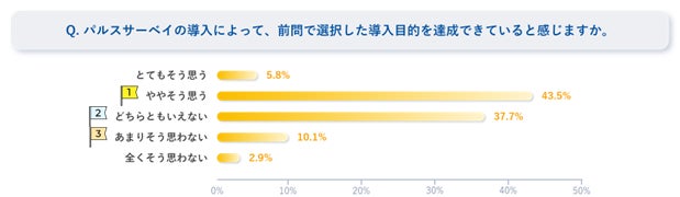 パルスサーベイ導入企業の目的は「従業員満足度やモチベーション状態の把握」や「エンゲージメント状態の把握」が高い。次いで、「メンタルヘルス状態の把握」と続く。その導入目的に対し「達成できている」と感じている割合は約半数となるものの、「とてもそう思う」の割合は5%強にとどまり、明確な達成実感を持てていない状態にあると推察される。