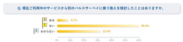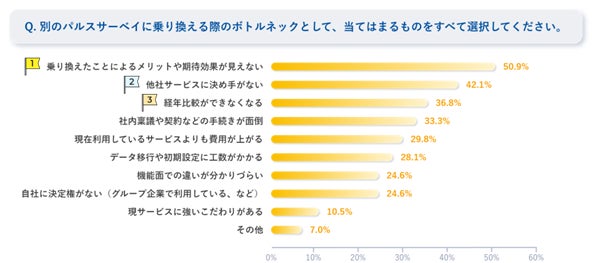 サーベイの乗り換えについては6割弱が「検討したことがない」と回答した。乗り換えにあたってのボトルネックとしては「メリットや期待効果が見えない」が半数を超える。