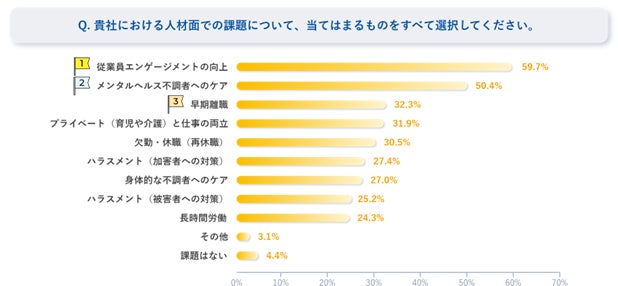 人材面における課題は「エンゲージメントの向上」が最も多く、6割以上が回答した。次いで、「メンタルヘルス不調者へのケア」、「早期離職」と続く。
