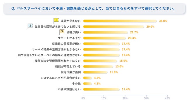 一方、パルスサーベイにおける不満や課題について最も多いのが「成果が見えない」となる。次いで、「従業員の回答が本音でないと感じる」、「価格が高い」と続く。数値を把握する目的は達成できていても、状態改善については課題を抱えている可能性も考えられる。