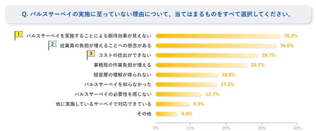 パルスサーベイを導入している企業は約3割に留まり、未導入企業は全体の6.5割を超える。導入に至らない理由として最も多いのが「期待効果が見えない」となり、次いで「従業員の負担が増えることへの懸念がある」と続く。実施に踏み出せない背景が、さまざまな観点から存在していることがうかがえる。