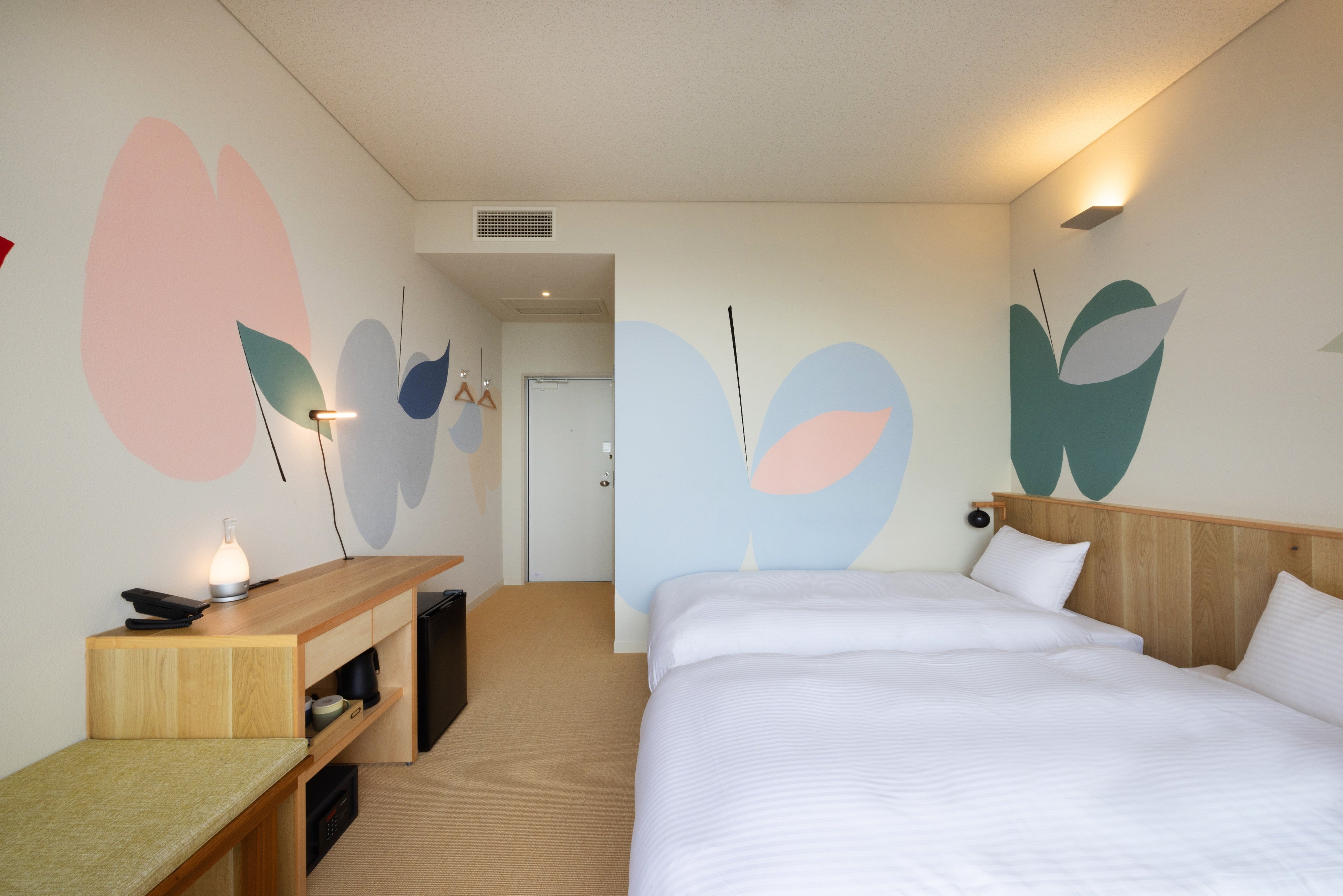 10人の個性豊かなアーティストによるオリジナルアートワークを各部屋にほどこしており、壁面はライブペイントで彩られ、アーティストの世界感を存分にお楽しみいただけます。ベッドやインテリアには木材や麻といったプリミティブな素材を使用し、西海岸の借景や風や波の移ろいを感じる空間へと整えています。客室アメニティや備品は、環境負荷を出来る限り避けたものをご用意。ハチミツや小麦胚芽、アロエ、ブナ材などナチュラルなものばかりを厳選してつくられたACCA KAPPAのアメニティと、やさしい触り心地のバスタオルで安らぐ時間を演出しています。