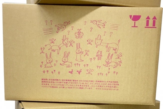 「いぬ、ねこ、とり、かえる、とかげなど生き物が大好き。とくにエサを食べているところを見るのが好き。」という花島愛弥さんの優しさ溢れる作品が描かれた配送箱。普段何気なく使用している配送箱もハートフルな動物たちが描かれていると、より丁寧に配送箱を扱うようになったり、思わず笑顔もこぼれます。