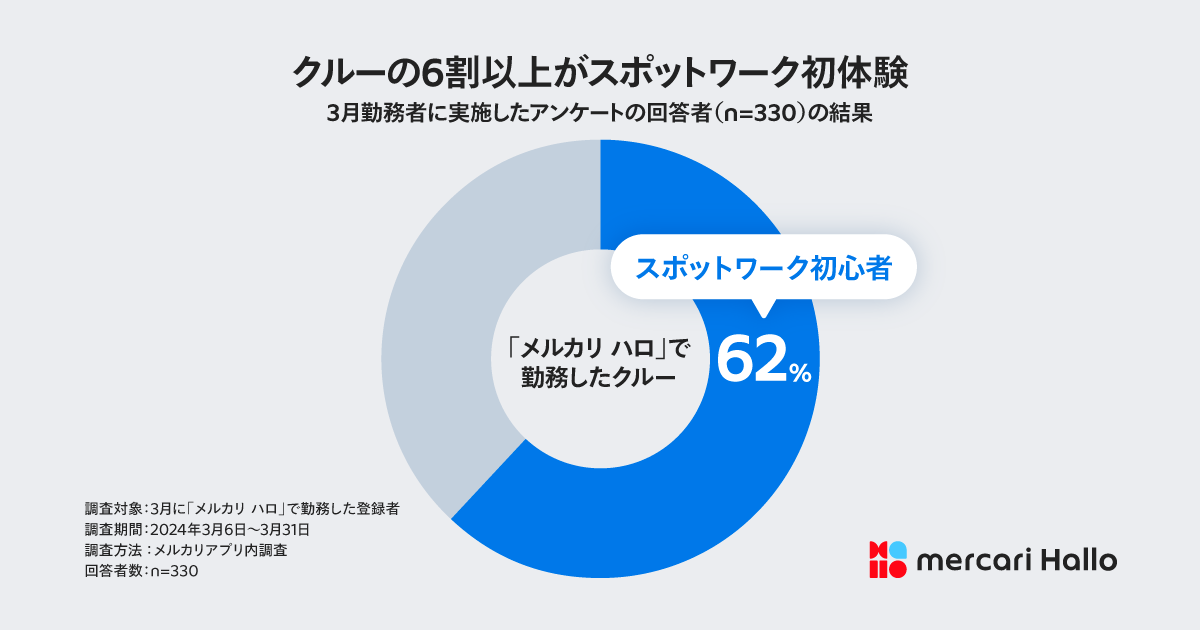 メルカリが3月に勤務したクルーを対象にアンケートを実施した結果、「メルカリ ハロ」を通じて勤務したクルーの62%がはじめてスポットワークを利用した「スポットワーク初心者」であることがわかりました。これまでスポットワークを経験したことがなかったお客さまも、慣れ親しんだ「メルカリ」を通じて、気軽にお仕事がはじめられています。