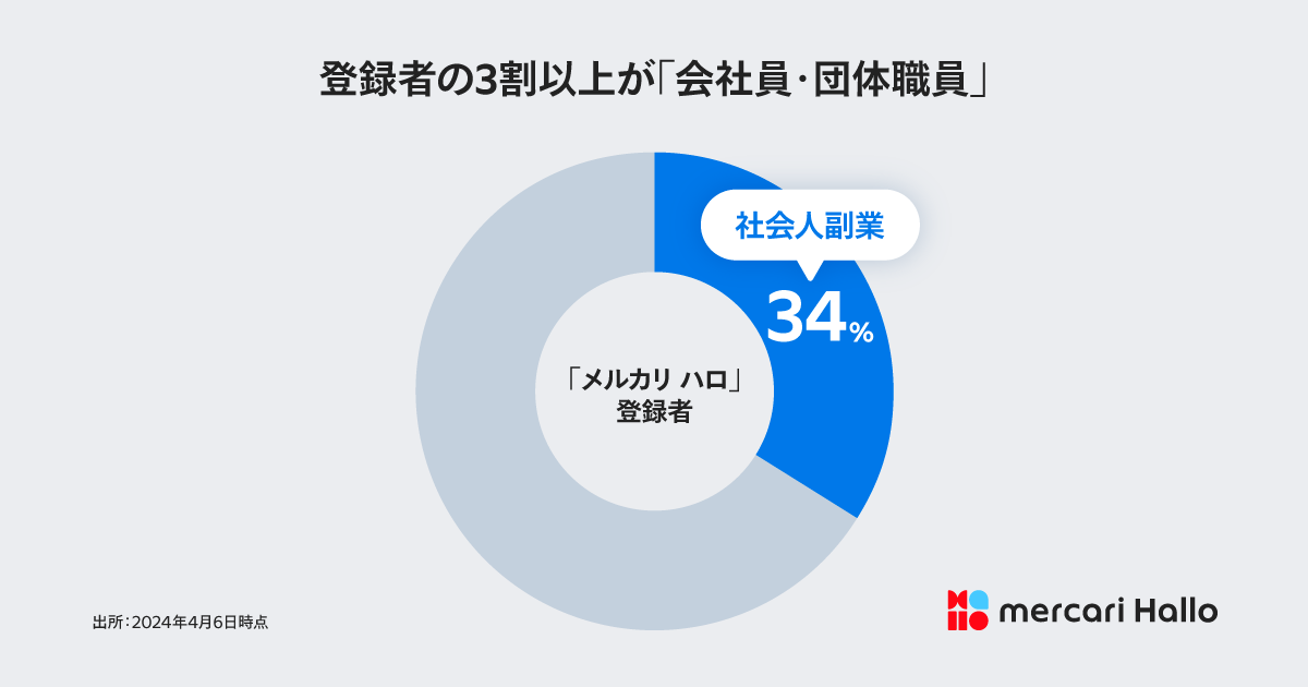 「メルカリ ハロ」は従来のアルバイト従事者や学生の方だけではなく、「社会人副業」にも活用いただいています。登録者の3人に1人以上(34%)が会社員・団体職員であり、高まる副収入ニーズの受け皿にもなっています。