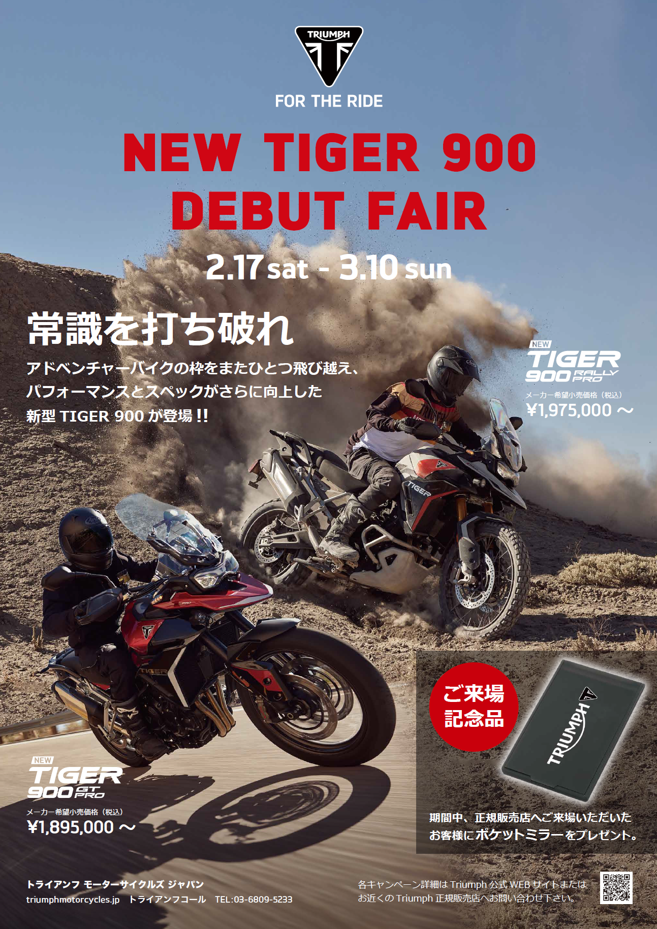 トライアンフモーターサイクルズジャパン株式会社(本社:東京都港区海岸 代表取締役社長:大貫陽介)は、2月17日~3月10日までの期間中、全国のトライアンフ正規販売店にて新型「Tiger 900デビューフェア」を開催することをお伝えします。