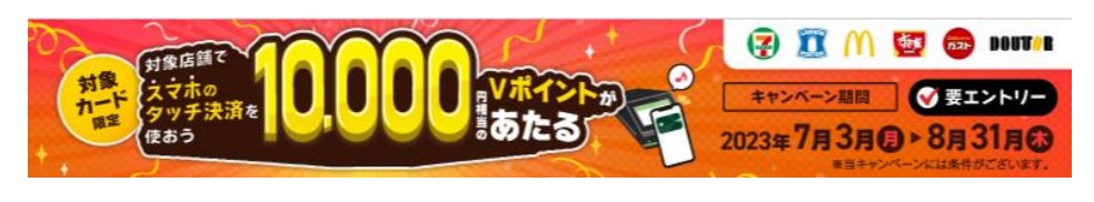 「対象のコンビニ・飲食店で最大7%ポイント還元」サービスのリニューアルを記念して、「スマホのタッチ決済を使おう!10,000円相当のVポイントがあたる!」キャンペーンを実施いたします。
