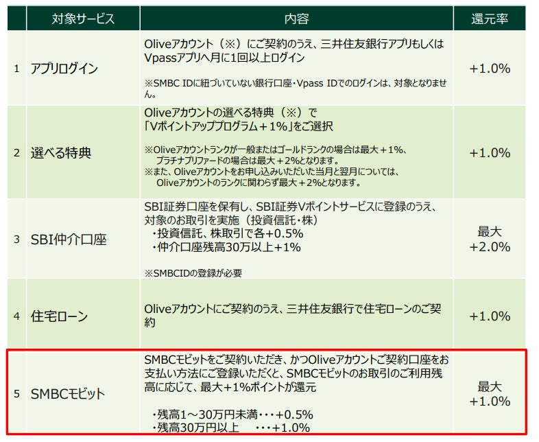 2023年7月1日より、対象のサービスのご利用状況に応じたポイント還元を行う「Vポイントアッププログラム」に、SMBCモビットをご契約、かつOliveアカウント契約口座をお支払い口座に登録いただくと、SMBCモビットのお取引のご利用残高に応じて対象のコンビニ・飲食店でのご利用時に最大+1%ポイント還元する対象サービスを追加いたします。