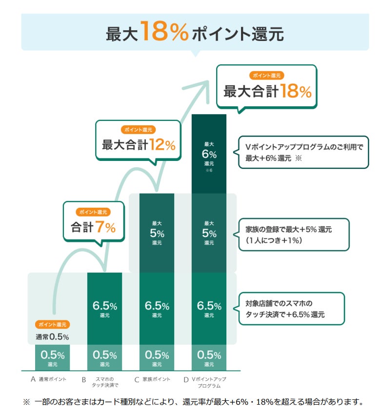 今回のポイントサービス拡充により、Vポイントアッププログラムの対象サービスご利用と、家族ポイントサービスへご登録、対象カードを登録したスマホのタッチ決済ご利用で、対象のコンビニ・飲食店で最大18%ポイント還元となります。