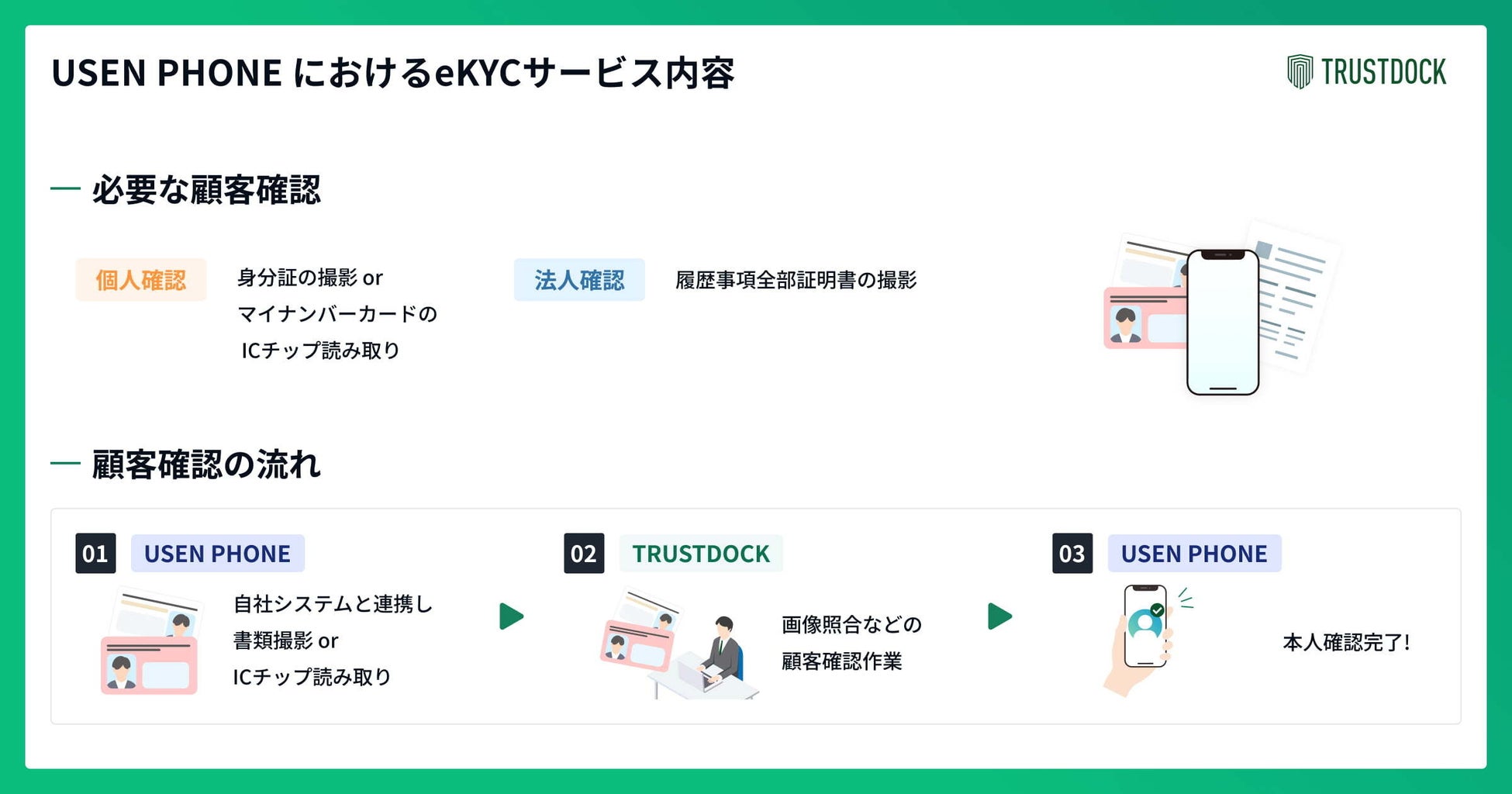株式会社TRUSTDOCK(東京都中央区、代表取締役:千葉 孝浩、以下TRUSTDOCK)は、USEN&U-NEXT GROUPの株式会社USEN(東京都品川区、代表取締役社長:貴舩 靖彦、以下USEN)が展開する業務用IP電話「USEN PHONE」に、eKYCサービス「TRUSTDOCK」の提供を開始いたしました。