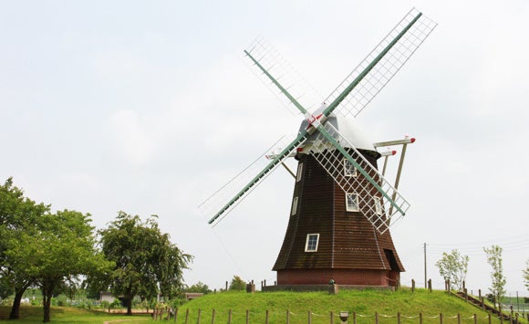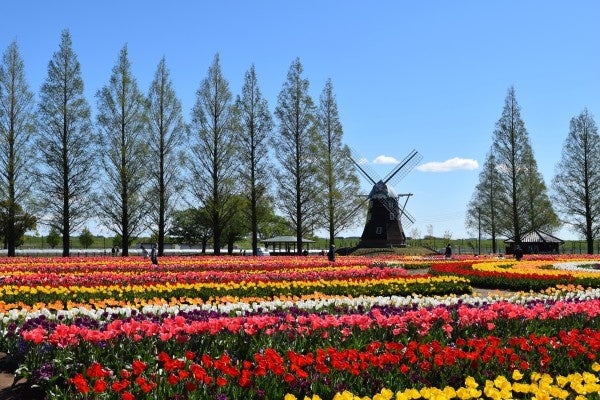 風車とチューリップ畑のフォトジェニックな景観をお楽しみいただけます(柏市あけぼの山農業公園)