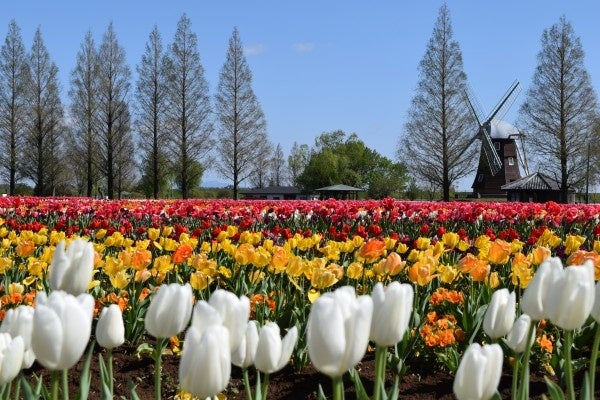 本公園で、風車の前に広がる約1.2haの「チューリップの花畑」が4月上旬より開花します。