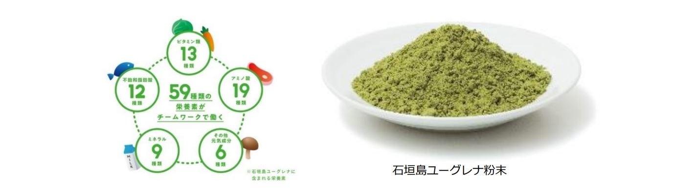 ユーグレナは藻の仲間です。豊かな石垣島の自然で育った石垣島ユーグレナは、人間が必要とする豊富な59種の栄養素(ビタミン、ミネラル、アミノ酸、DHA、オレイン酸などの不飽和脂肪酸、特有成分パラミロン※1など)を持ち、細胞壁をもたないため、栄養の消化吸収率も高い特長があるスーパーフードです。