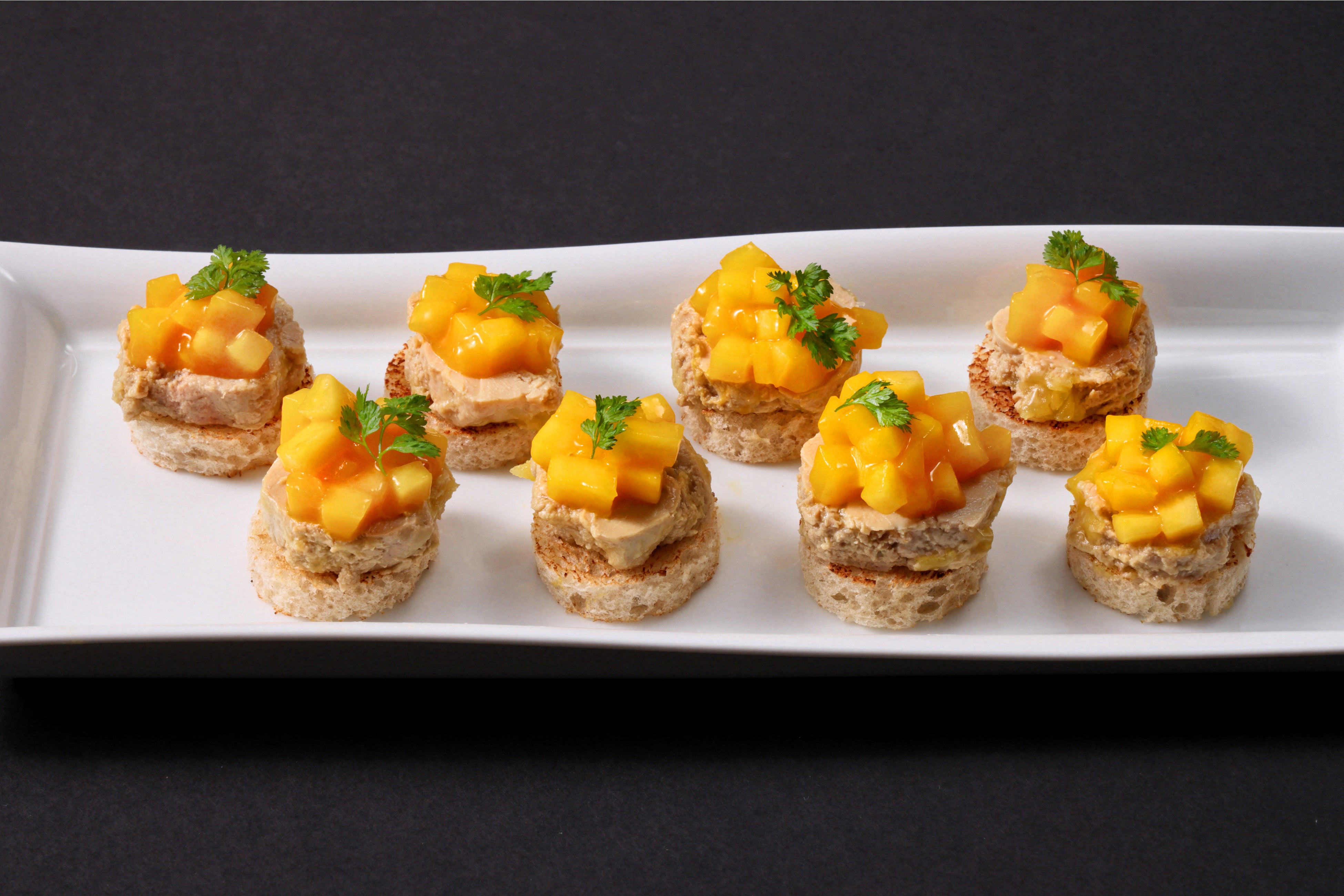 濃厚なフォアグラのテリーヌは石垣島産のマンゴー、パッションフルーツで酸味を効かせた夏仕立て