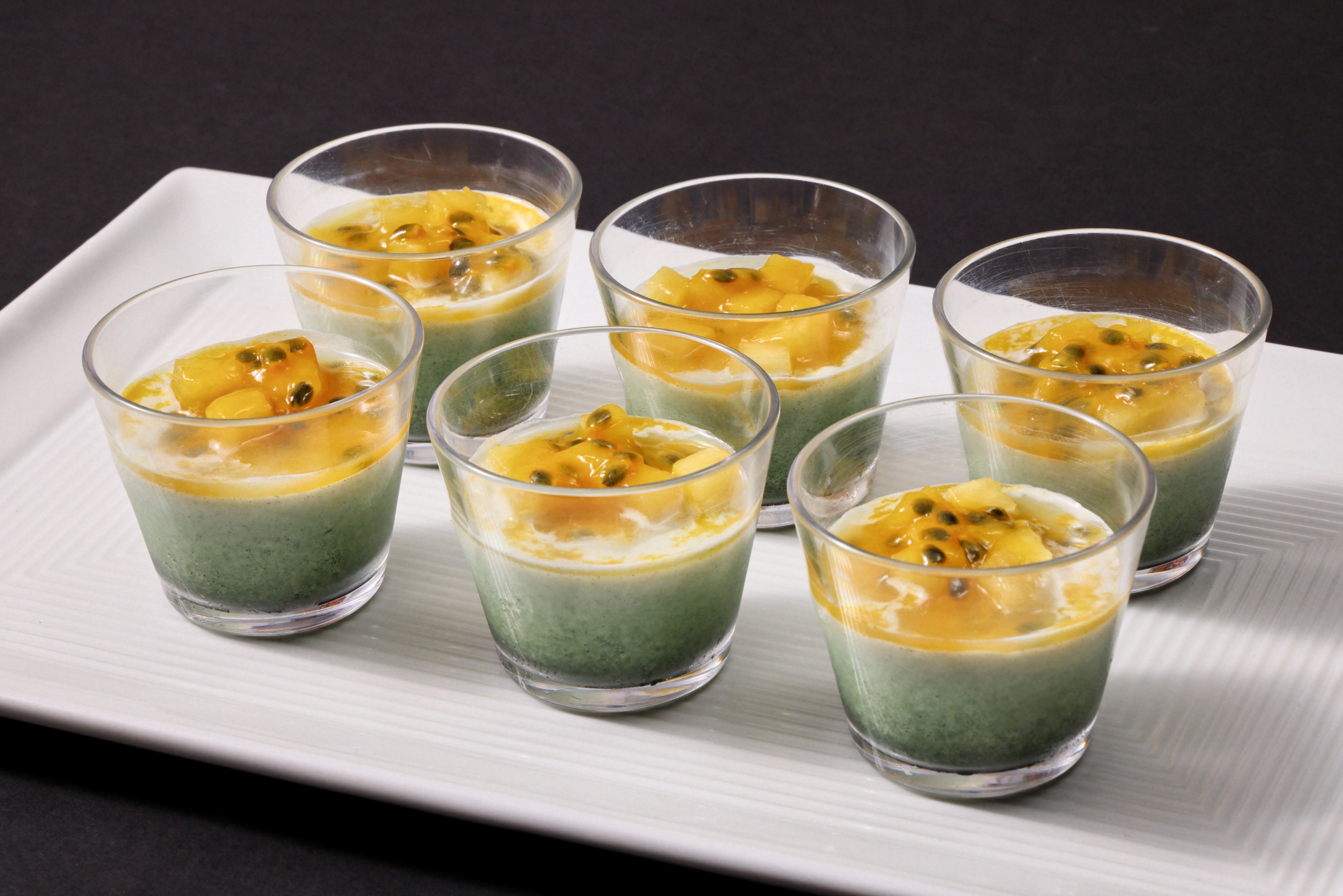 乳製品と相性抜群の「からだにユーグレナ やさしいフルーツオレパウダー」をパンナコッタに。旬のパインやパッションフルーツを合わせた季節感のある一皿