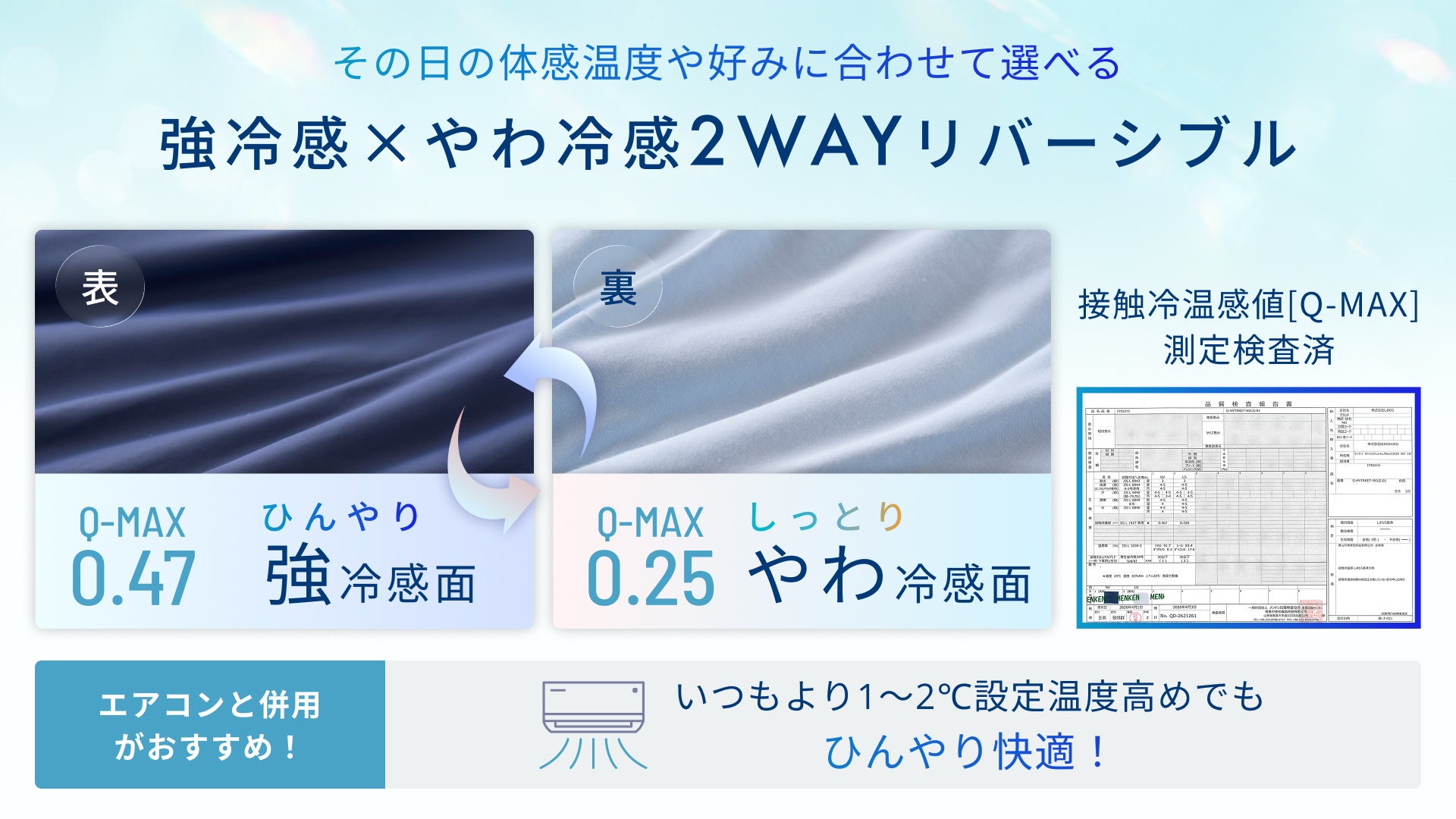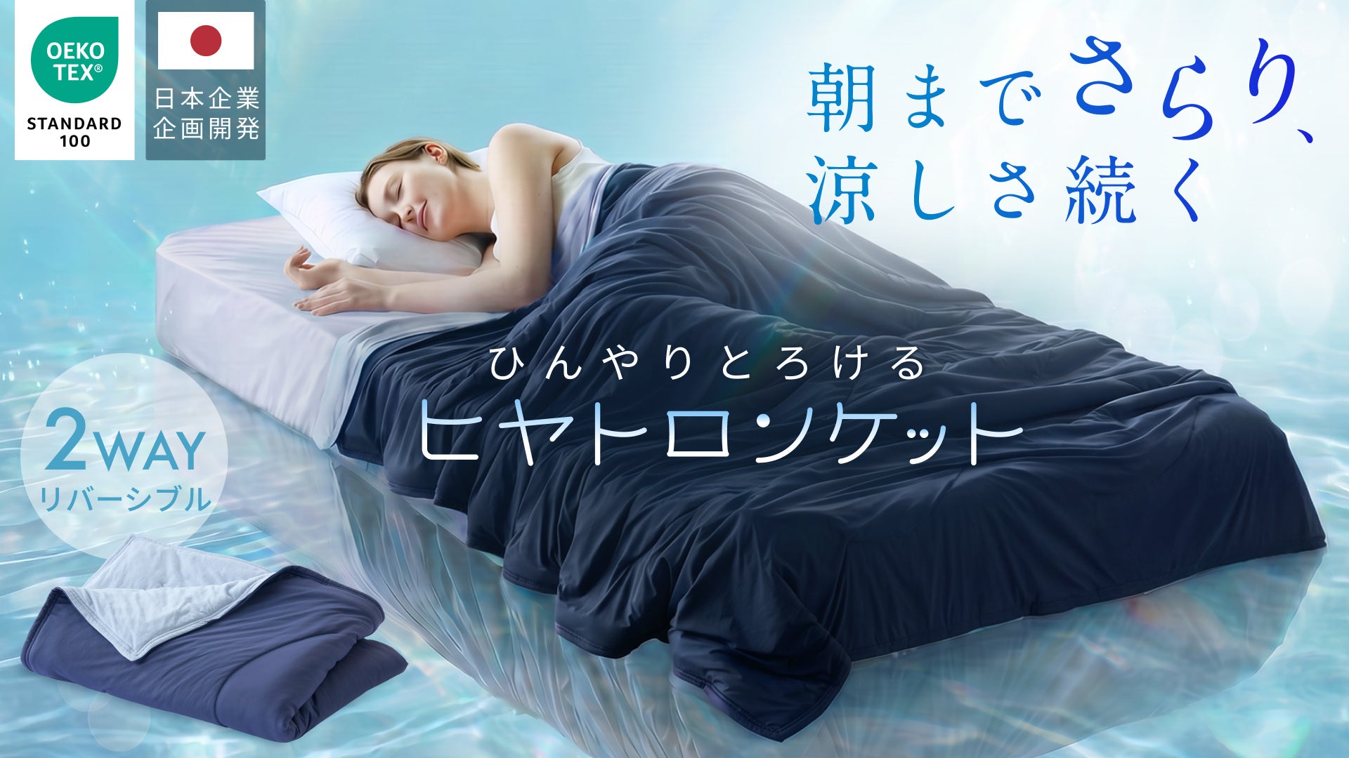 「エアコンをつけると寒いが、消すと暑くて眠れない」「汗でべたついて夜中に何度も目が覚める」——こうした夏特有の睡眠ジレンマに着目し、表面Q-MAX 0.47の強冷感素材と裏面Q-MAX 0.25のやわ冷感素材を組み合わせた2WAYリバーシブル構造と、植物由来アセテート調整わたによる吸湿・抗菌防臭機能、約1.4kgの適度な重さを1枚に凝縮した、夏の快眠ケットです。