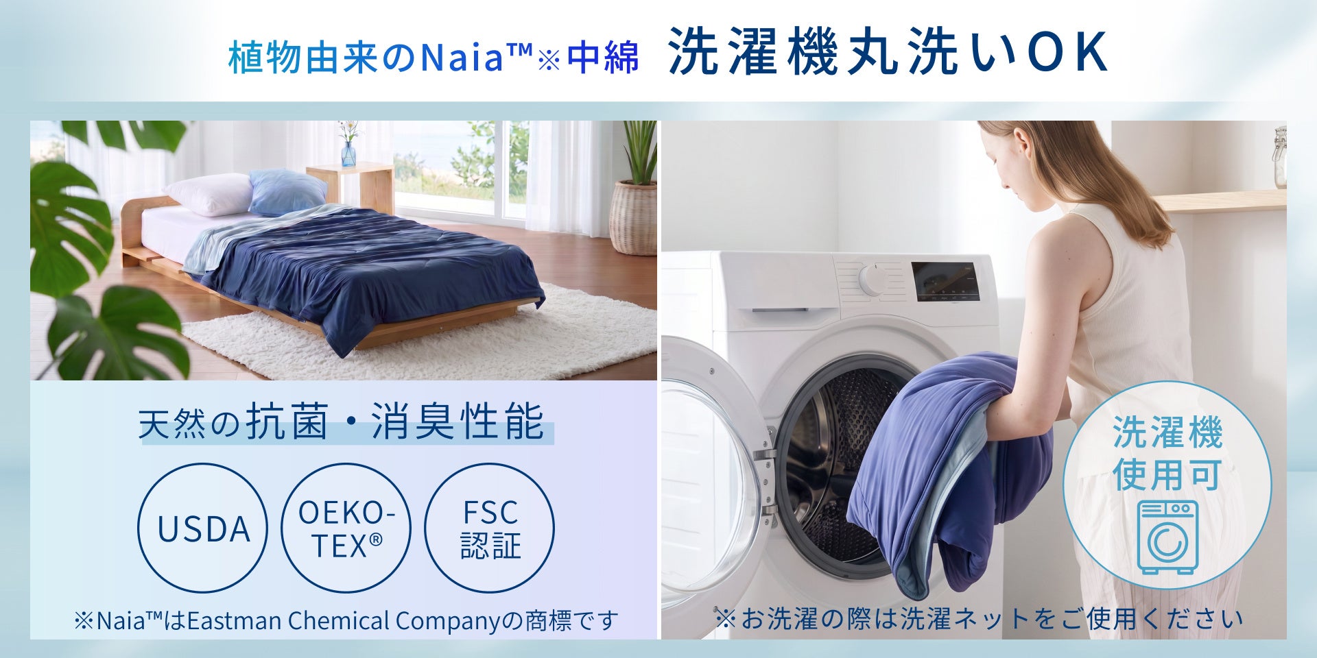 中わたに採用した「Naia™」(米国Eastman Chemical Company社)は、USDA/OEKO-TEX®/FSC®の3つの国際認証を取得した木材パルプ由来でつくられ、菌の繁殖を抑える植物由来繊維です。汗をかきやすい夏でも、嫌なにおいを防ぎます。また、洗濯機での丸洗いが可能(洗濯ネット使用)で乾きも早いため、夏じゅう清潔・快適にお使いいただけます。