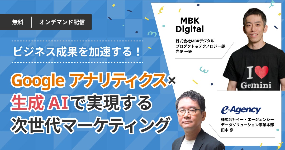 株式会社イー・エージェンシー(東京都千代田区、代表取締役:甲斐真樹、以下イー・エージェンシー)は、株式会社MBKデジタル(本社:東京都千代田区、代表者:芹澤新、以下MBKデジタル)と共催で行ったセミナー「ビジネス成果を加速する!Google アナリティクス×生成 AI で実現する次世代マーケティング」の内容を2025年5月28日(水)にオンデマンド動画として公開しました。