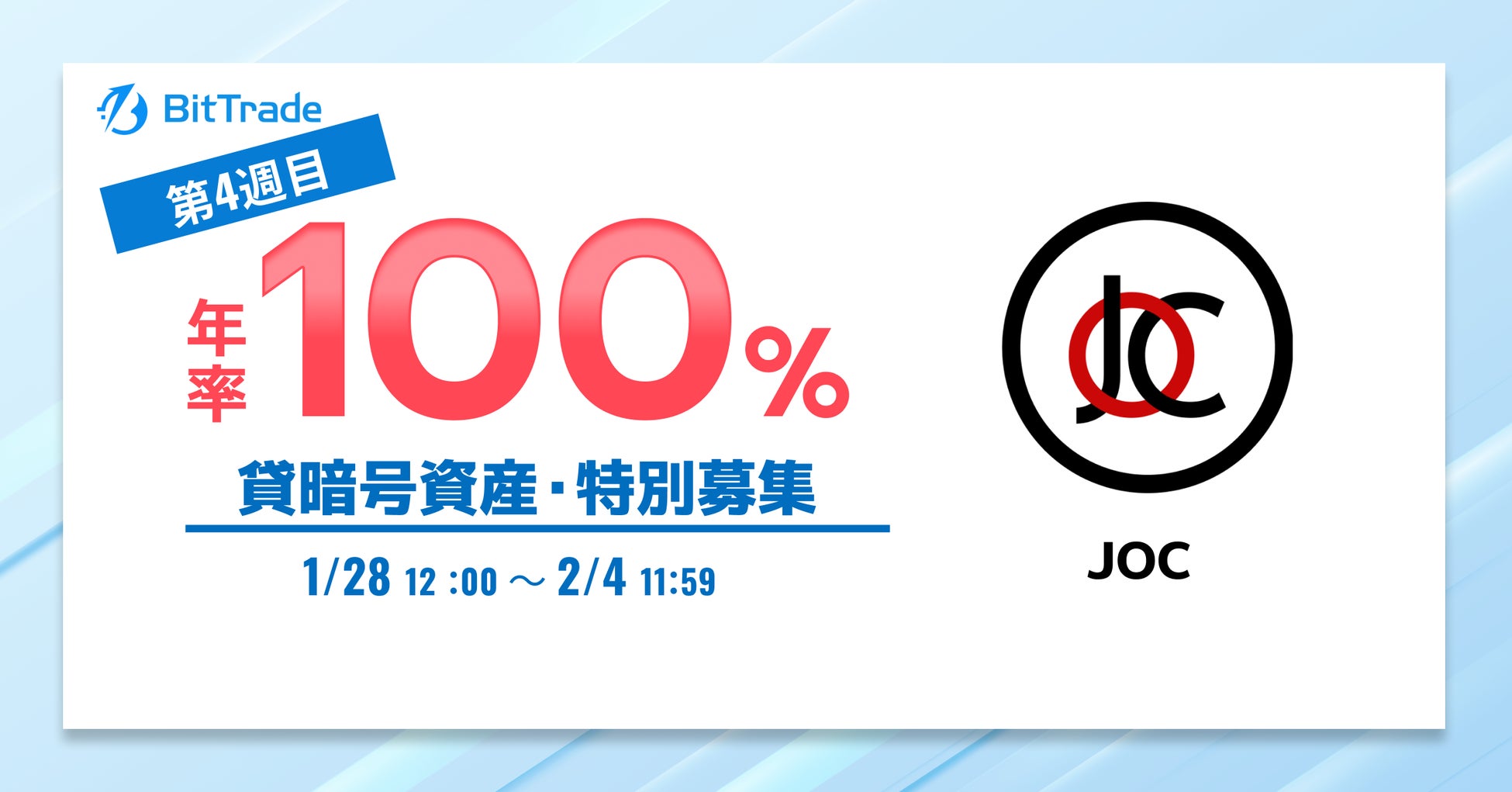 ビットトレード株式会社(所在地:東京都港区、代表取締役社長:関 磊、以下「ビットトレード」)は、2025年1月28日(火)12:00より、 ジャパンオープンチェーントークン(JOC)の貸暗号資産特別募集を実施いたします。是非ご参加ください。