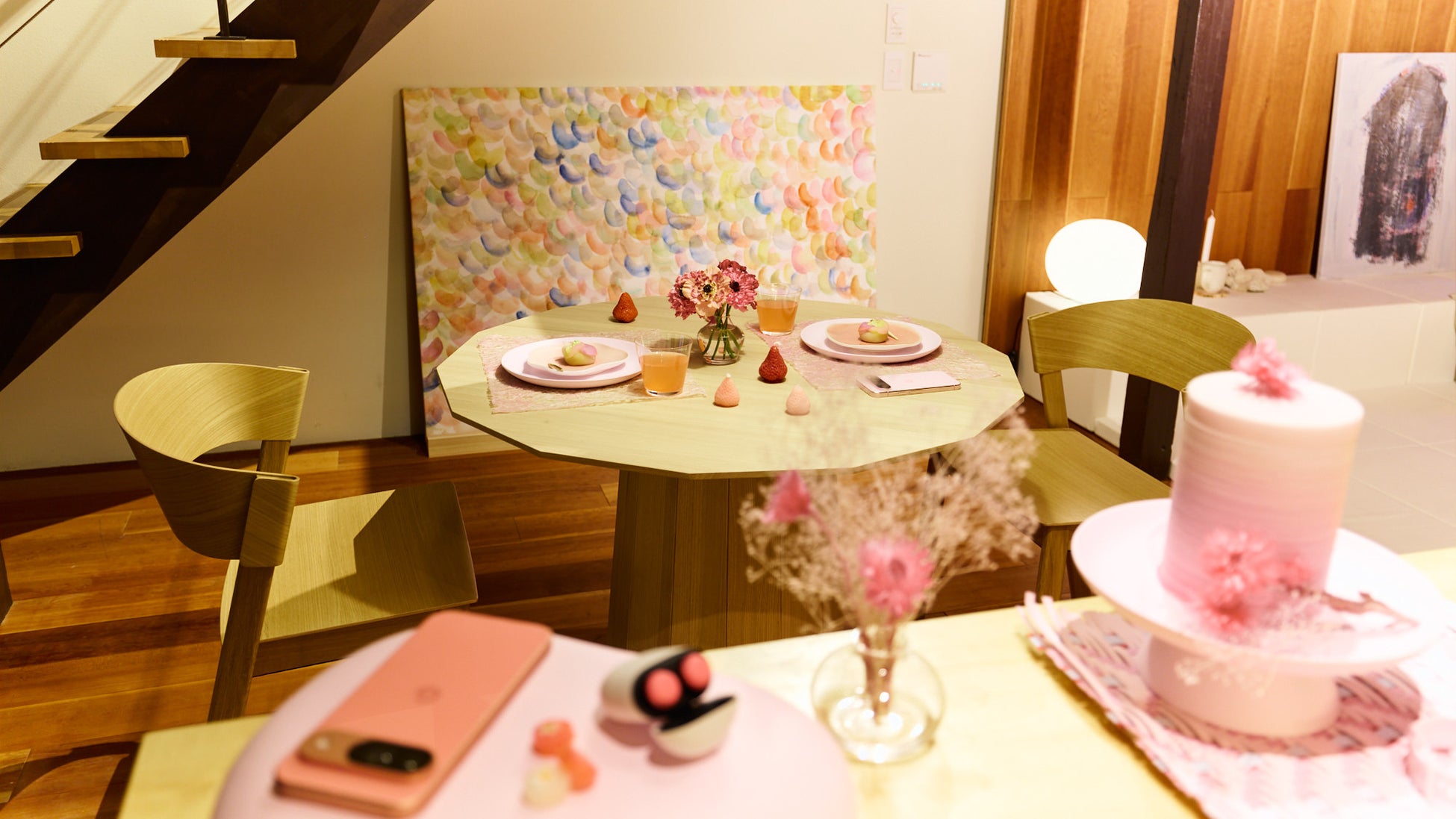 Google Pixel 9 シリーズのキーカラー「Peony」(芍薬)「Rose QuartzQuarts」(紅石英)が彩るダイニングルーム。色によってもたらされる「Confident」「Delightful」といった感情にまつわる味覚体験をお楽しみください。「Peony」「Rose QuartzQuarts」カラーに彩られた、京都の和菓子屋「菓子屋のな」の生菓子や、国内外の主に知的障害のある作家と共に新たな文化の創造を目指すヘラルボニーの契約作家 SATO氏のアート作品などが、味覚による感情の変化を呼び起こします。