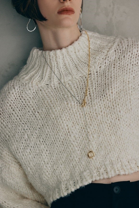 ゴールドとシルバー、両方のメタル感を楽しめるコンビカラーのデザインで、どの角度から見ても曲線になる滑らかなラインが印象的なネックレスです。