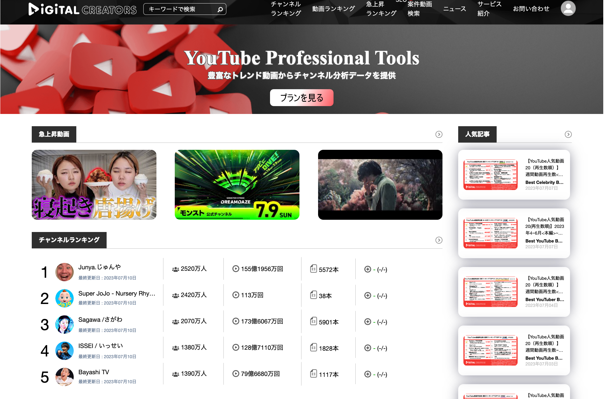 Digital Creatorsは、YouTubeの人気チャンネルや動画などのランキングデーターを無料でチェックできるサイトです。YouTube動画再生数ランキングは、週間ランキングや月間ランキングや年間ランキングなど期間別のランキングのほかに、ジャンル別ランキングなど、様々なデーターを公開していく予定です。