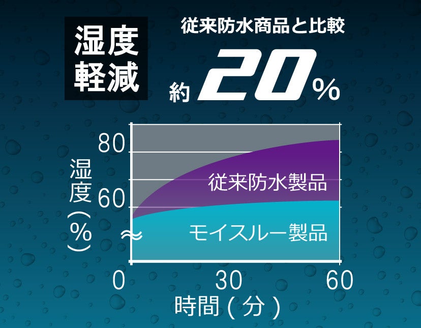 さらに、この技術によって、従来の防水製品と比べ靴内の湿度を約20%軽減することに成功。また、一般的な防水製品の基準が地面から4cmの水に浸して2時間なのに対し、モイスルー360は3倍の6時間以上※の防水を達成しました。