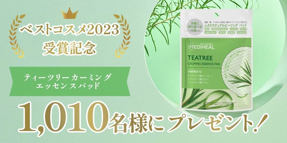 X(旧Twitter)にて、メディヒール日本公式アカウントをフォローいただき、キャンペーン投稿をRT&いいねしていただいた方の中から、抽選で1,010名様にベストコスメを受賞した「ティーツリーカーミングエッセンスパッド」の10枚入りタイプをプレゼントいたします。
