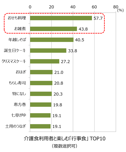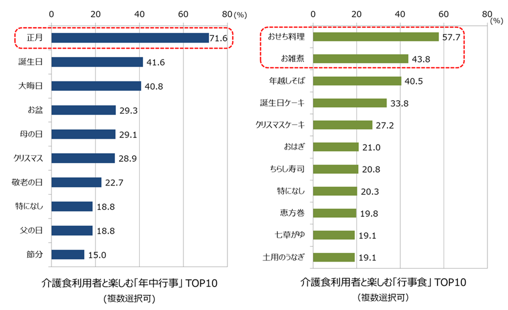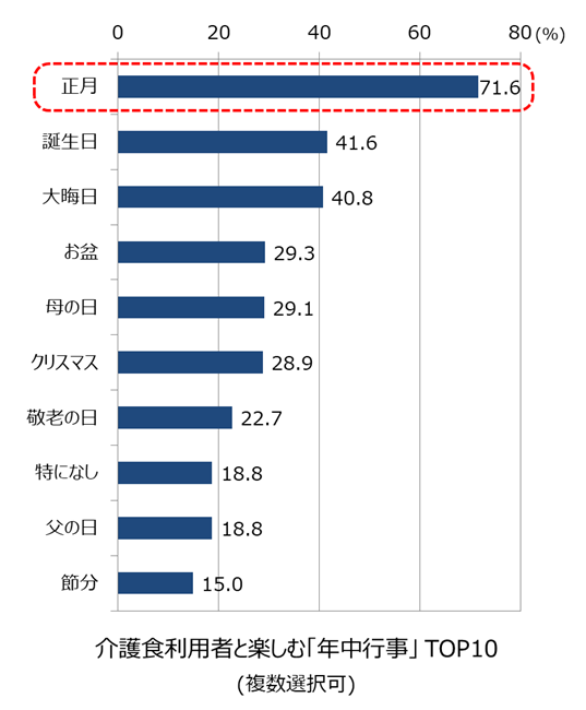 キユーピーの調査では、介護食利用者と楽しむ『年中行事』の1位は「お正月」、『行事食』の1位は「おせち」、2位は「お雑煮」と、お正月が高齢者にとって1年で最も大切な年中行事であることが分かります(【参考データ】参照)。2021~22年はコロナ禍で行動制限を伴うお正月でしたが、2023年は久しぶりに家族や親戚が集まってお正月を祝うにぎやかな情景の復活が期待されます。