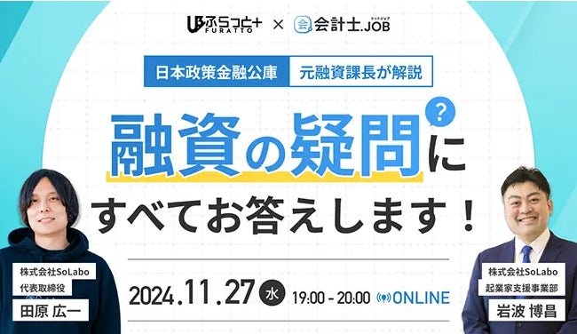 株式会社SoLabo(本社:東京都千代田区、代表取締役:田原 広一)は、公認会計士に特化したワーキングプラットフォーム「会計士.job」を運営する、ブリッジコンサルティンググループ株式会社と共催するウェビナーを共催いたします。本ウェビナーでは、日本政策金融公庫で20年の勤務歴を持つ担当者が登壇し、融資支援に関する実務的な知識とノウハウを分かりやすくご紹介します。ウェビナー後半には質疑応答の時間を設け、参加者の皆様が抱える疑問や悩みを解消します。