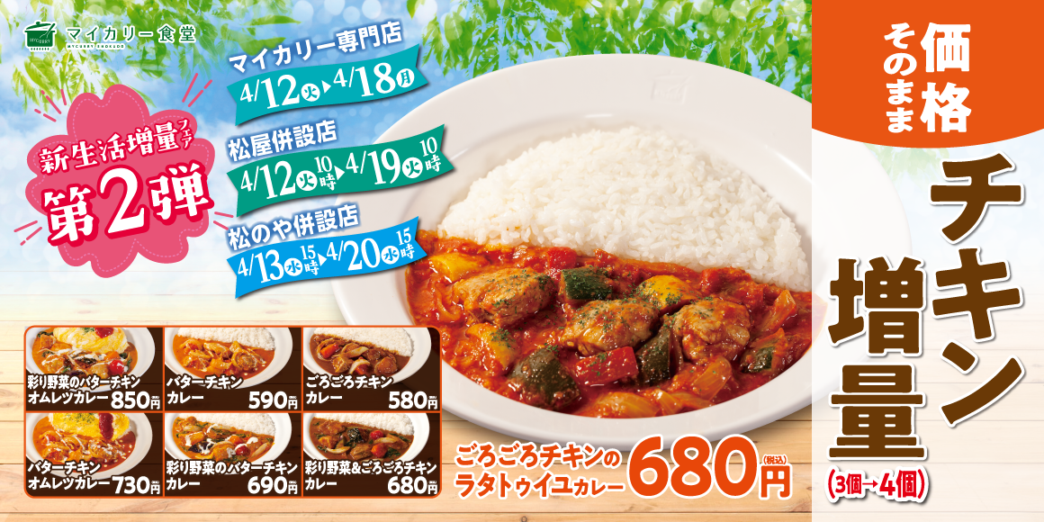 | 対象商品 ごろごろチキンカレー 580円 彩り野菜&ごろごろチキンカレー 680円 バターチキンカレー 590円 彩り野菜のバターチキンカレー 690円 バターチキンオムレツカレー 730円 彩り野菜のバターチキンオムレツカレー 850円 ごろごろチキンのラタトゥイユカレー 680円 トッピングチキン 200円 ※お持ち帰りいただけます。 ※全て税込み価格です。また、店内・お持ち帰りの税込価格は同一です。 ※マイカリー専門店は価格が異なります。 ※「彩り野菜のバターチキンオムレツカレー」はマイカリー専門店での販売はございません。 ※「ごろごろチキンのラタトゥイユカレー」は沖縄県店舗での販売はございません。 開催期間 【マイカリー食堂専門店】4月12日(火)10時 ~ 4月18日(月)閉店時刻 【松屋併設店】4月12日(火)10時 ~ 4月19日(火)10時 【松のや併設店】4月13日(水)15時 ~ 4月20日(水)15時 対象店舗 一部店舗を除く全国のマイカリー食堂 |