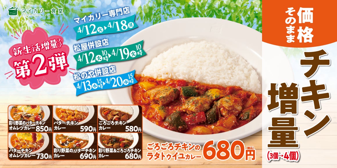 このたび松屋フーズ(本社:東京都武蔵野市、代表取締役社長:瓦葺一利)では、カレー専門店「マイカリー食堂」におきまして、2022年4月12日(火)午前10時より「新生活増量フェア第2弾」を開催いたします。