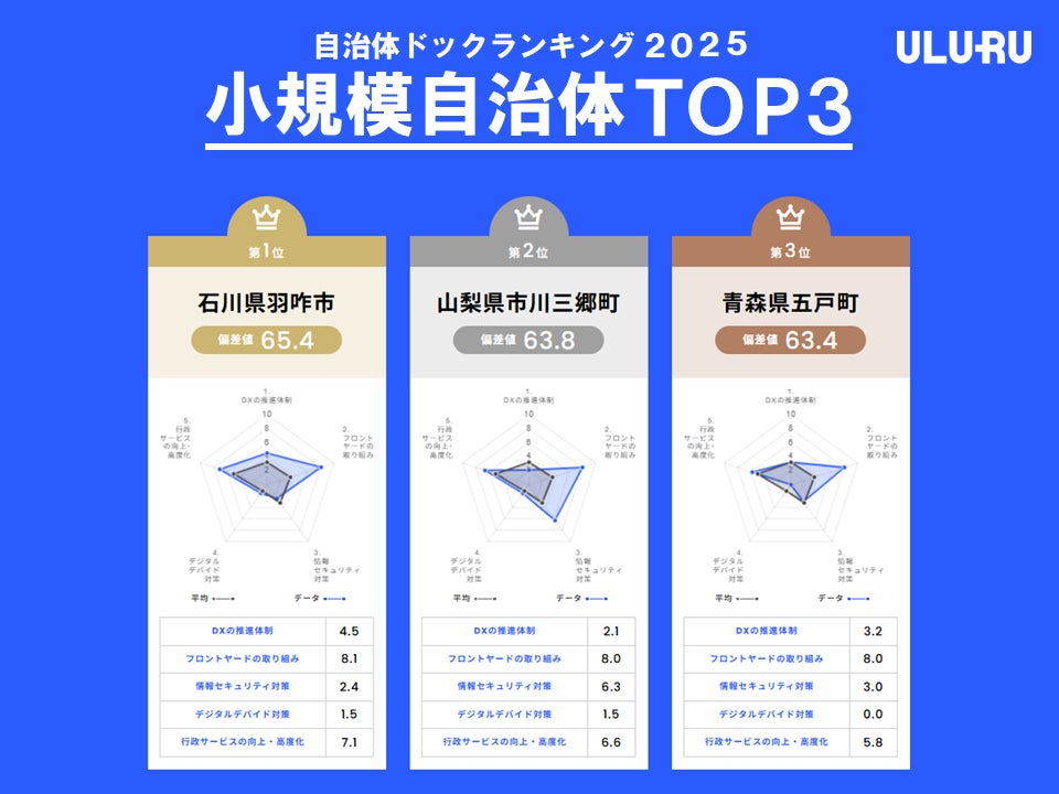 労働力不足問題解決のリーディングカンパニーとして複数のSaaSを展開する株式会社うるる(東京都中央区、代表取締役社長:星 知也、以下「うるる」)は、全国1,741自治体のDX推進度を”見える化”する「自治体ドックランキング 2025」を8月26日(火)に公開いたしました。本ランキングは、総務省が実施する「自治体DX・情報化推進概要(地方公共団体における行政情報化の推進状況調査結果)」を一次データとして活用し、うるる独自の評価設計に基づき5分野でスコア化したものです。全国1,741自治体を対象に「全国総合ランキング」および「人口規模別ランキング」(8段階)を付け、その結果から見える傾向を分析いたしました。