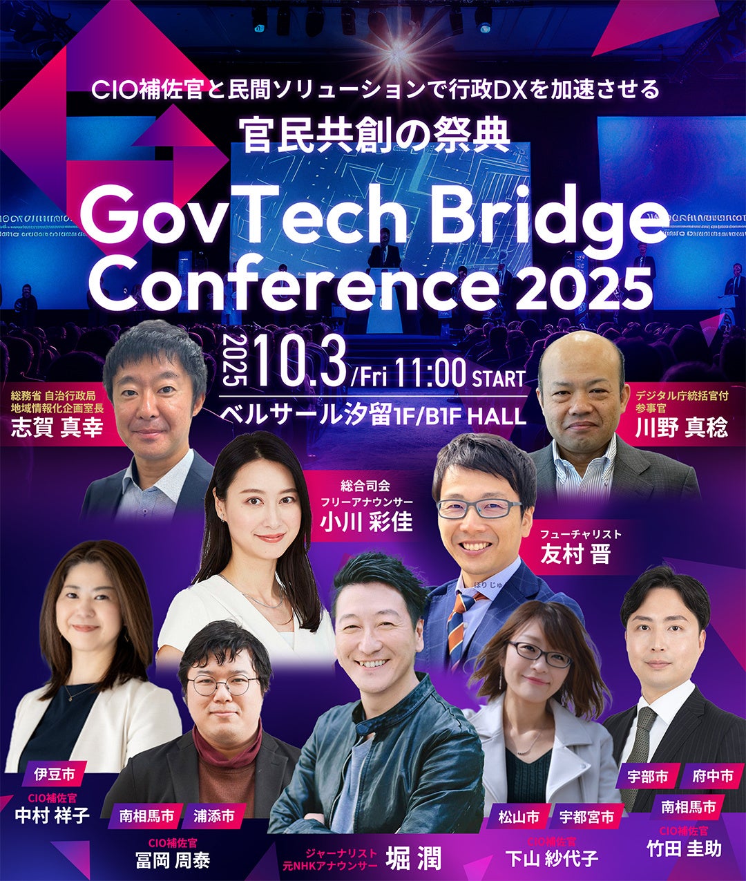 「GovTech Bridge Conference 2025」は、自治体の現役CIOおよびCIO補佐官やDX推進担当者、また自治体DXを支援する民間企業など、官民総勢500名以上が集結する、官民双方にフォーカスしたイベントです。この規模と内容でのイベント開催はこれまでに前例がなく、自治体DXの推進に向けた重要な機会です。