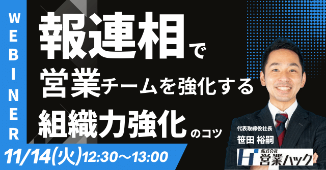 【緊急開催】報・連・相で営業チームを強化する!組織力強化のコツをテーマにウェビナーを開催します《11/14(火)12:30~無料オンラインセミナー》