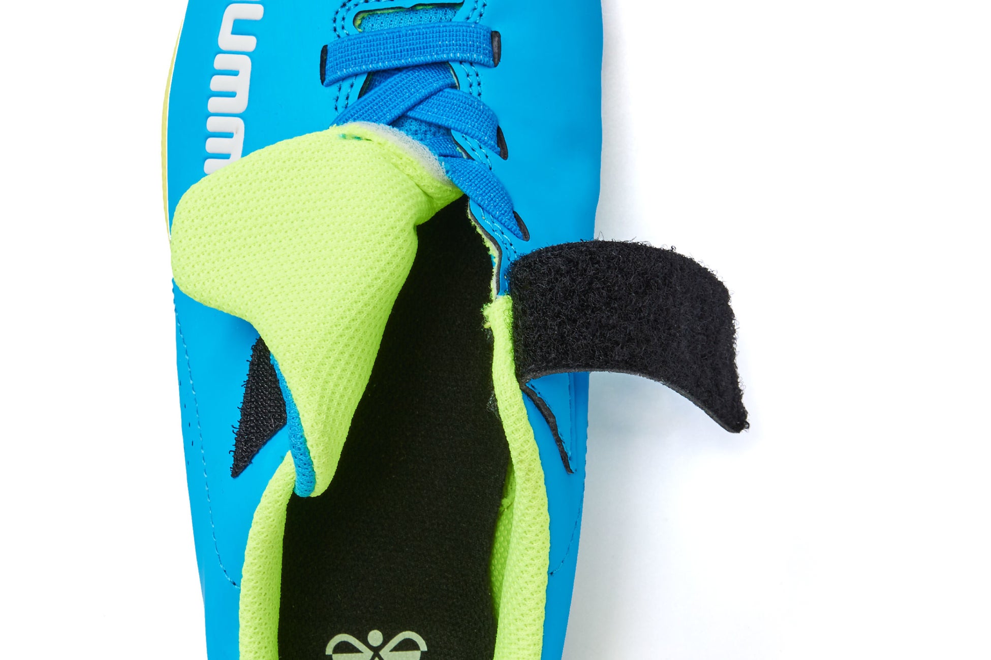 さらに、サッカーを始めるファーストシューズにも最適な面ファスナータイプは、ベルト部を改良。履き口が大きく開き、3か所の吸着箇所を設けたことでホールド感がアップ。より足にフィットするようになりました。また、履き口の広さとシューズを履く際にアシストするかかと部のストラップで、ひとりでシューズが履きやすい構造になっています。