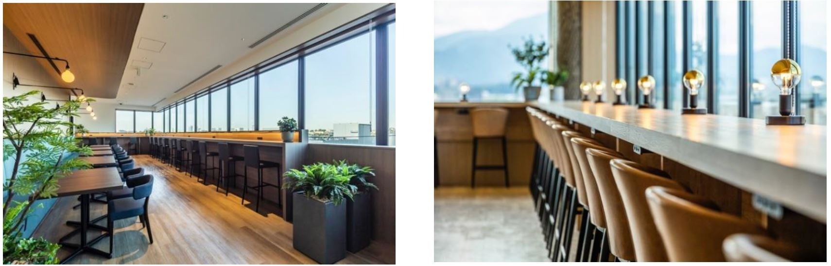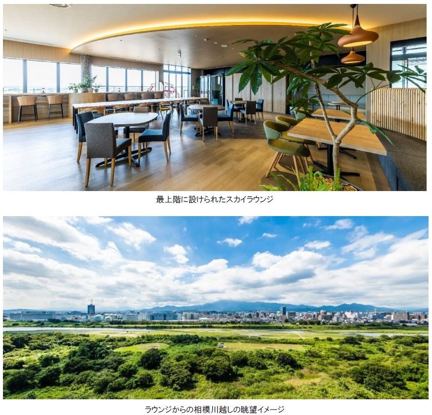 共用部では、働きやすい環境づくりを行うことで、従業者確保の促進に貢献しています。スケルトン天井の開放感あるワークプレイス(天井高3.5m)や、WEB会議にも対応した個人ブースを設けるなど、新しい働き方をサポート。このほか、建物東側の事務所棟バルコニーやスカイデッキには緑化を施し、最上階には相模川越しに丹沢連峰や富士山を一望できるラウンジを配しました。