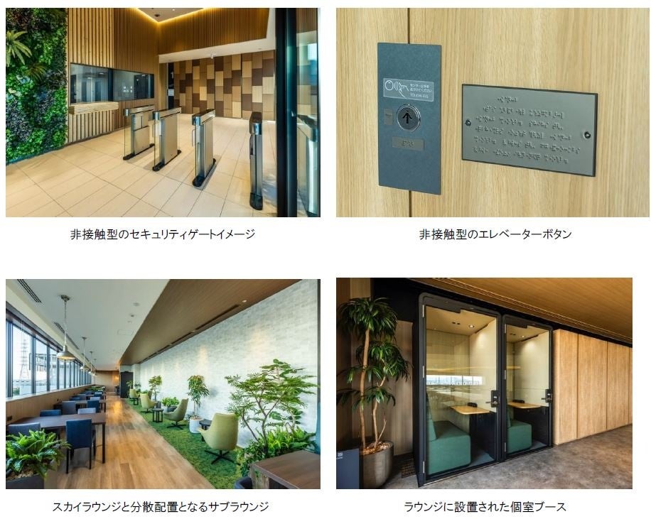 感染症対策として、エントランスには体温測定付き消毒液ディスペンサーを設置し、非接触型のセキュリティゲートやエレベーターを採用しました。また、ラウンジを分散配置することで休憩時間における利用者の密を減らし、安心してご利用いただける施設作りを行っています。