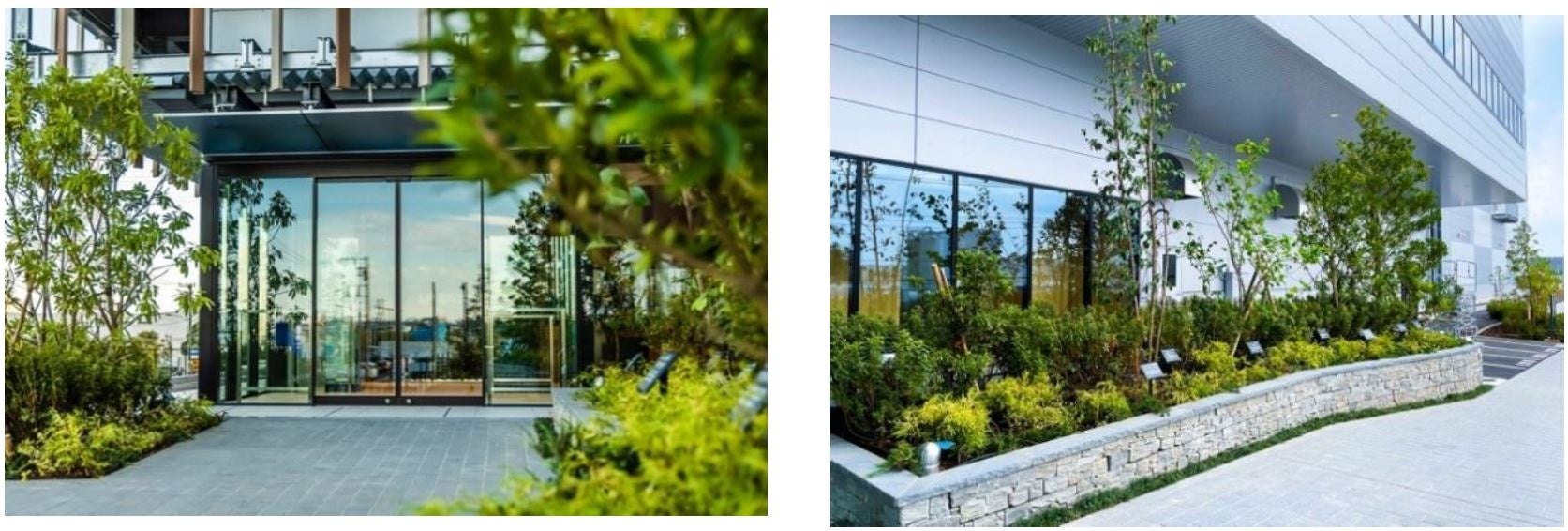 隣接する海老名運動公園との緩衝帯にグリーンインフラを整備。敷地全体の20%、約10,000㎡を緑地化し、約 1,500本の高中木、約15,000本の低木類等を植え「海老名の森」を創出しました。海老名運動公園との境界には公園側から借景となる桜並木を構築し、地域の景観にも配慮しています。