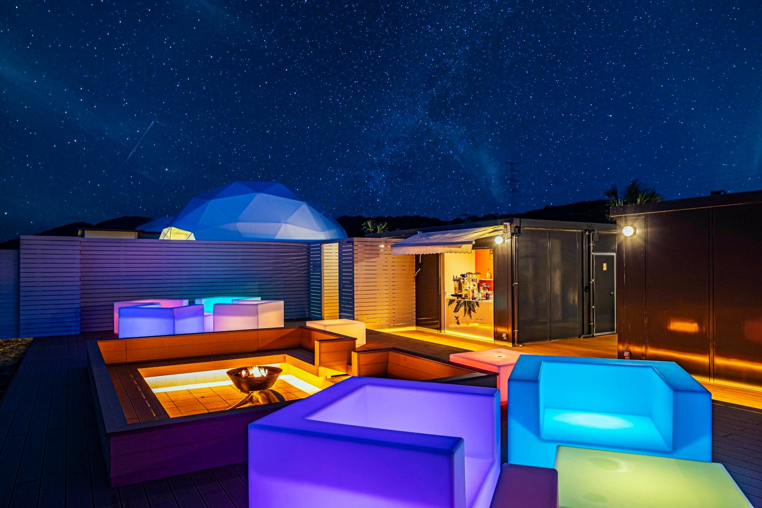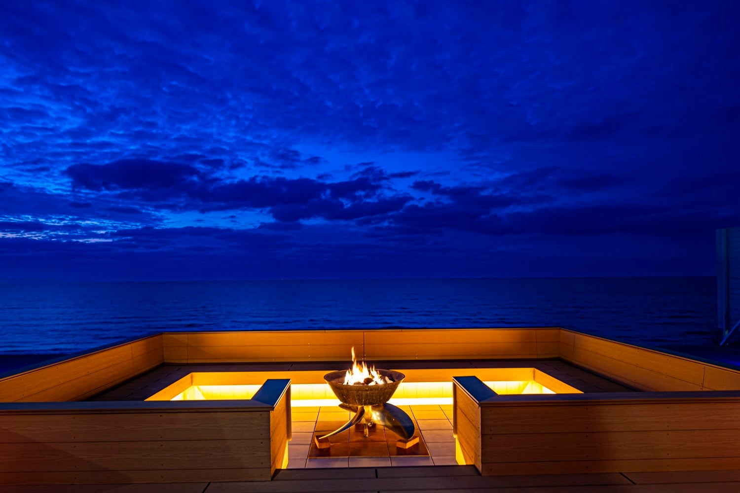 施設中央にある展望デッキスペースでは、目の前に広がる海と夜のライトアップが相まって、幻想的な空間が広がります。
