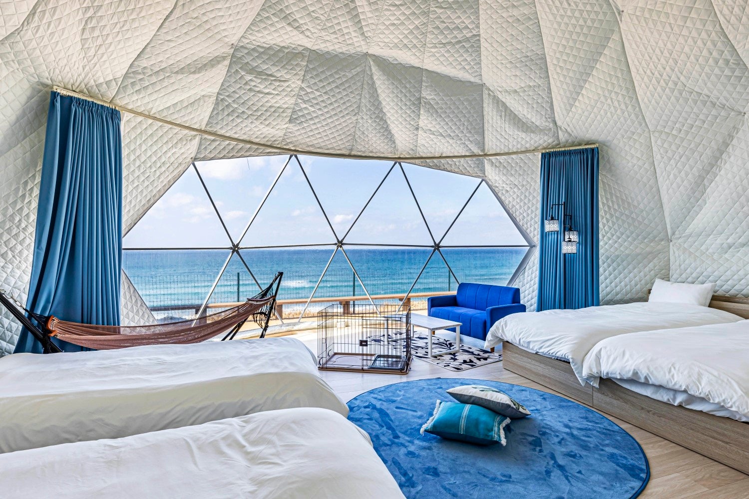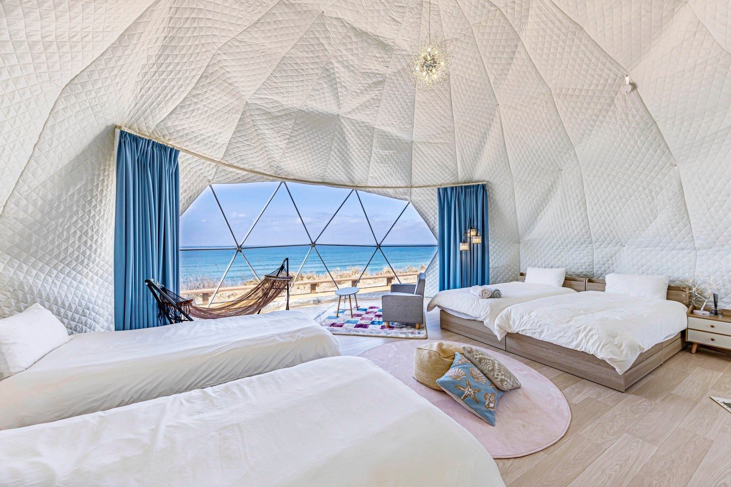 東シナ海の青い海を一望できる絶景スポットに立ち並ぶ全5棟のドームテント。