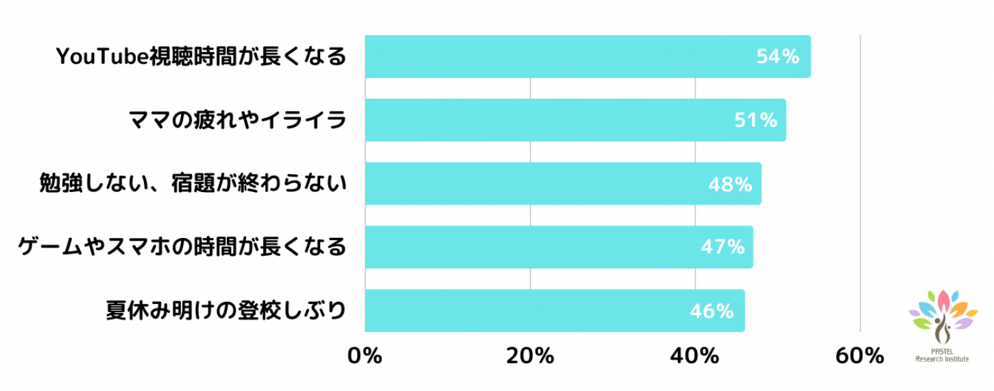 今年パステル総研が行った発達障害・グレーゾーンのお子さんをもつお母さんを対象に夏休みの過ごし方のアンケート夏休みの困りごとアンケート調査によると、悩みごとTOP5は以下のようになっており、91%ものお母さんが心配ごとがあると回答されていました<https://prtimes.jp/main/html/rd/p/000000337.000054387.html>。
