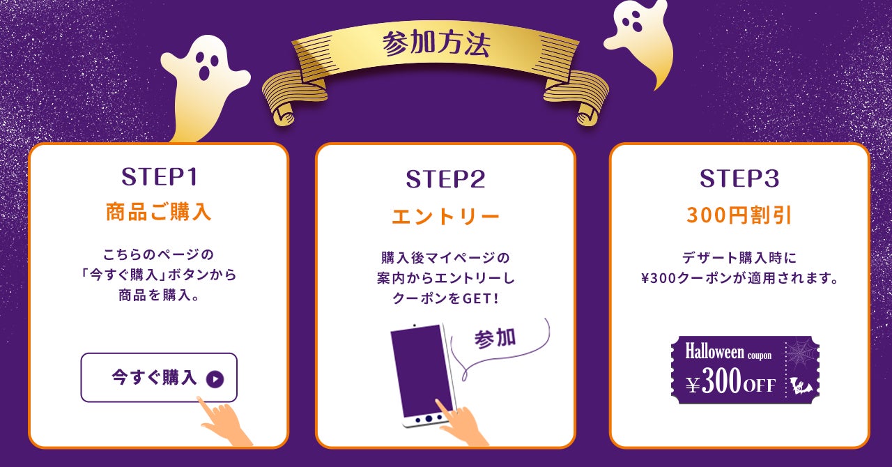 10/10〜10/31の期間中に、デザート購入時にご利用いただける合計900円分(300円×3)のクーポンをプレゼントいたします。クーポンは、商品購入後マイページからエントリーするだけで獲得いただけます。