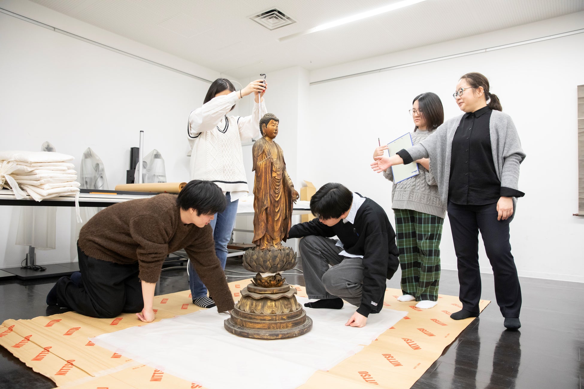 文化財・考古学コースの学びの柱は「文化財(美術史・工芸史)」「考古学」「博物館学」「文化財保存学」です。実際に文化財を手に取って保存・修復方法を学ぶ実習授業や博物館や美術館の実務を現地で体験できる機会もあります。また、博物館での絵画や工芸などの文化財展示を想定した「博物館展示論」、野外での遺跡の測量技術を学ぶ「考古学実習」など、学芸員や考古調査士の資格取得に必要な知識や技術を修得する科目が充実しており、文化財・考古学コースは、学内外のフィールドを生かして歴史を見る目を養います。